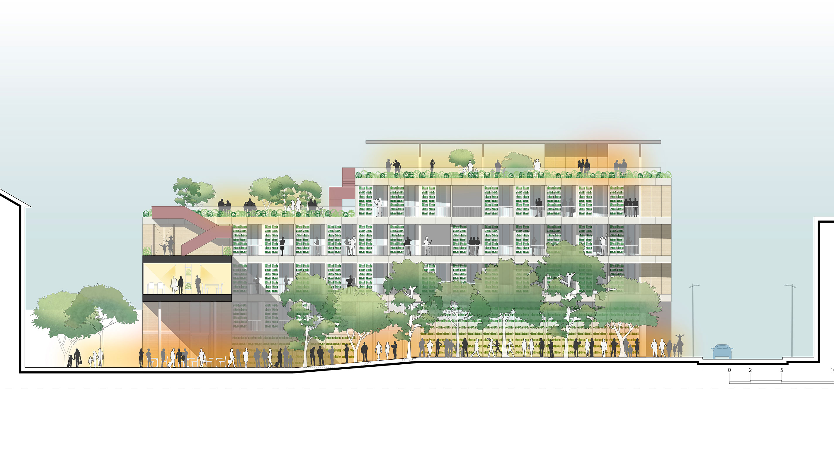 Forest quindi è un progetto aperto al cittadino, completamente permeabile dall’attacco a terra sino in copertura, per permettere a tutti di scoprire nuove frontiere del costruire, consapevoli e responsabili che il pianeta terra è uno e va preservato!