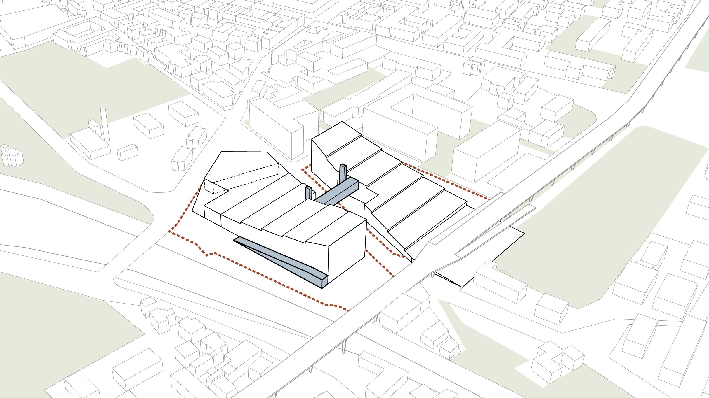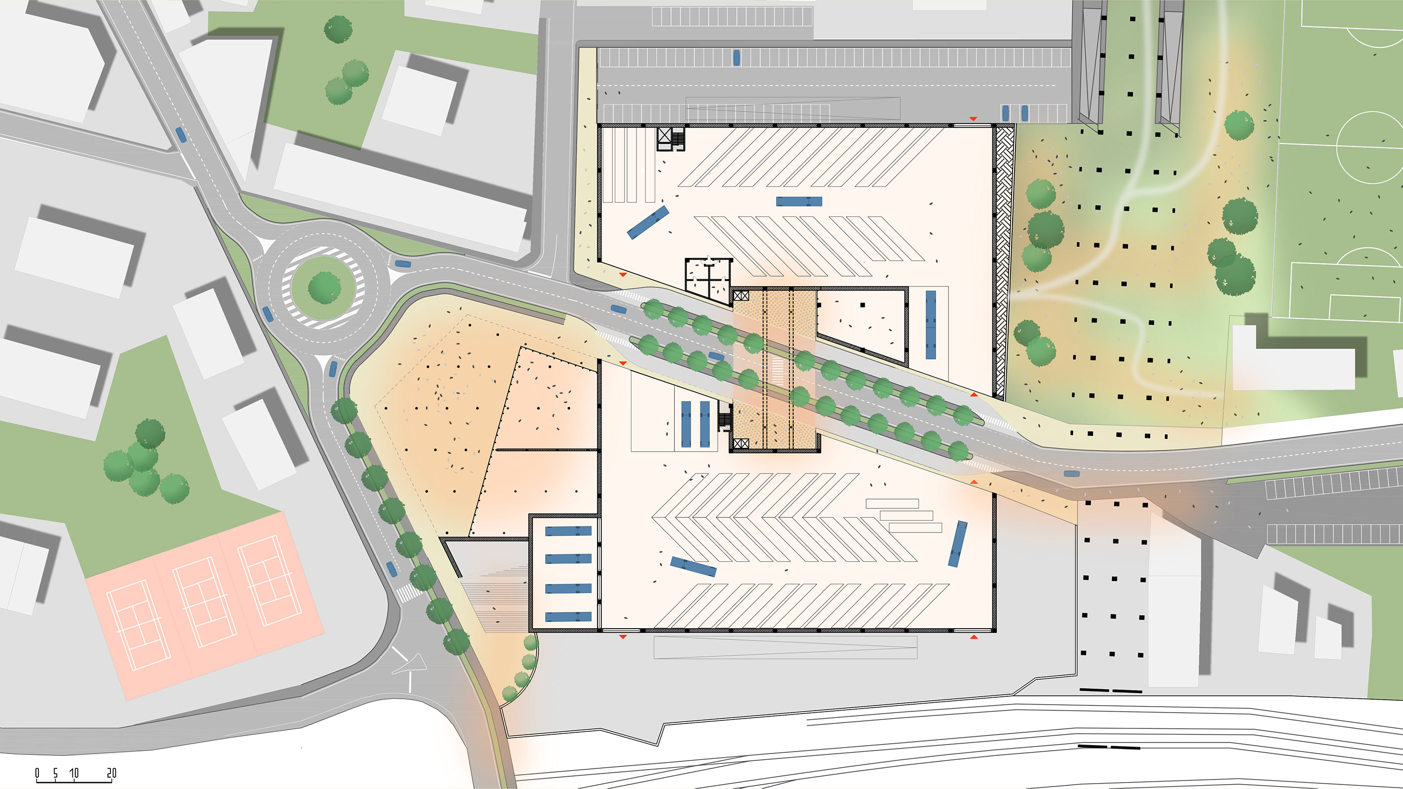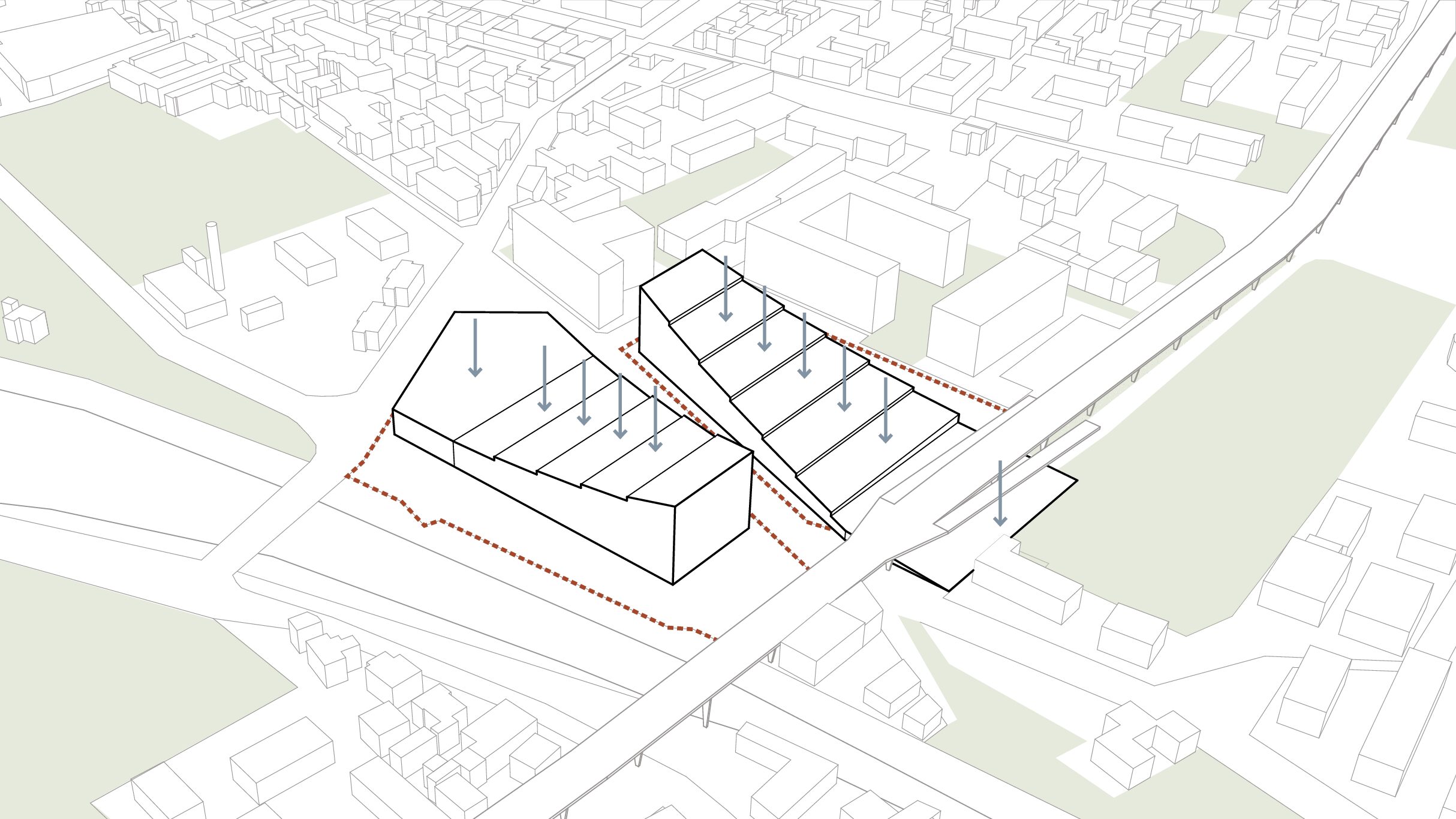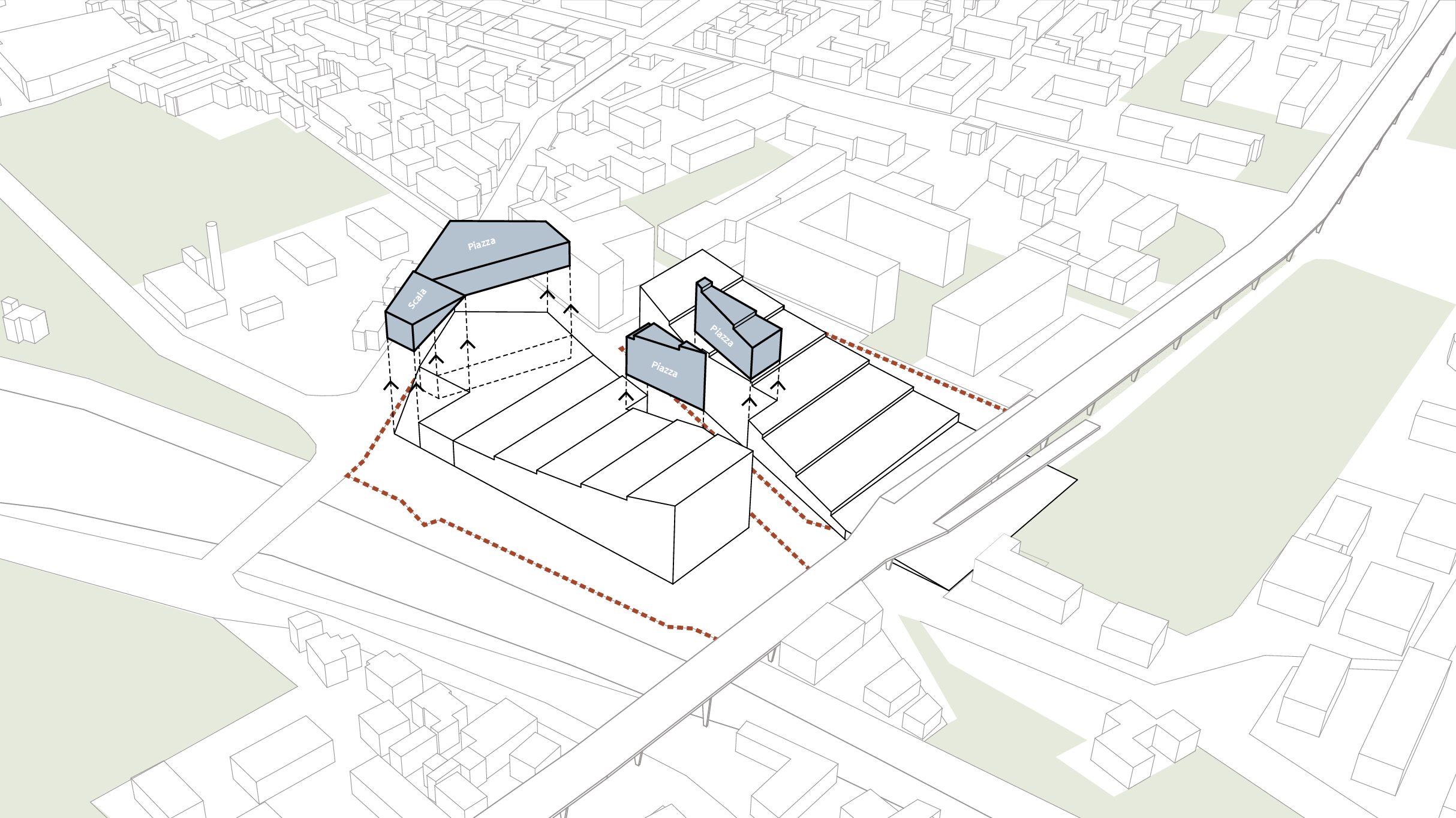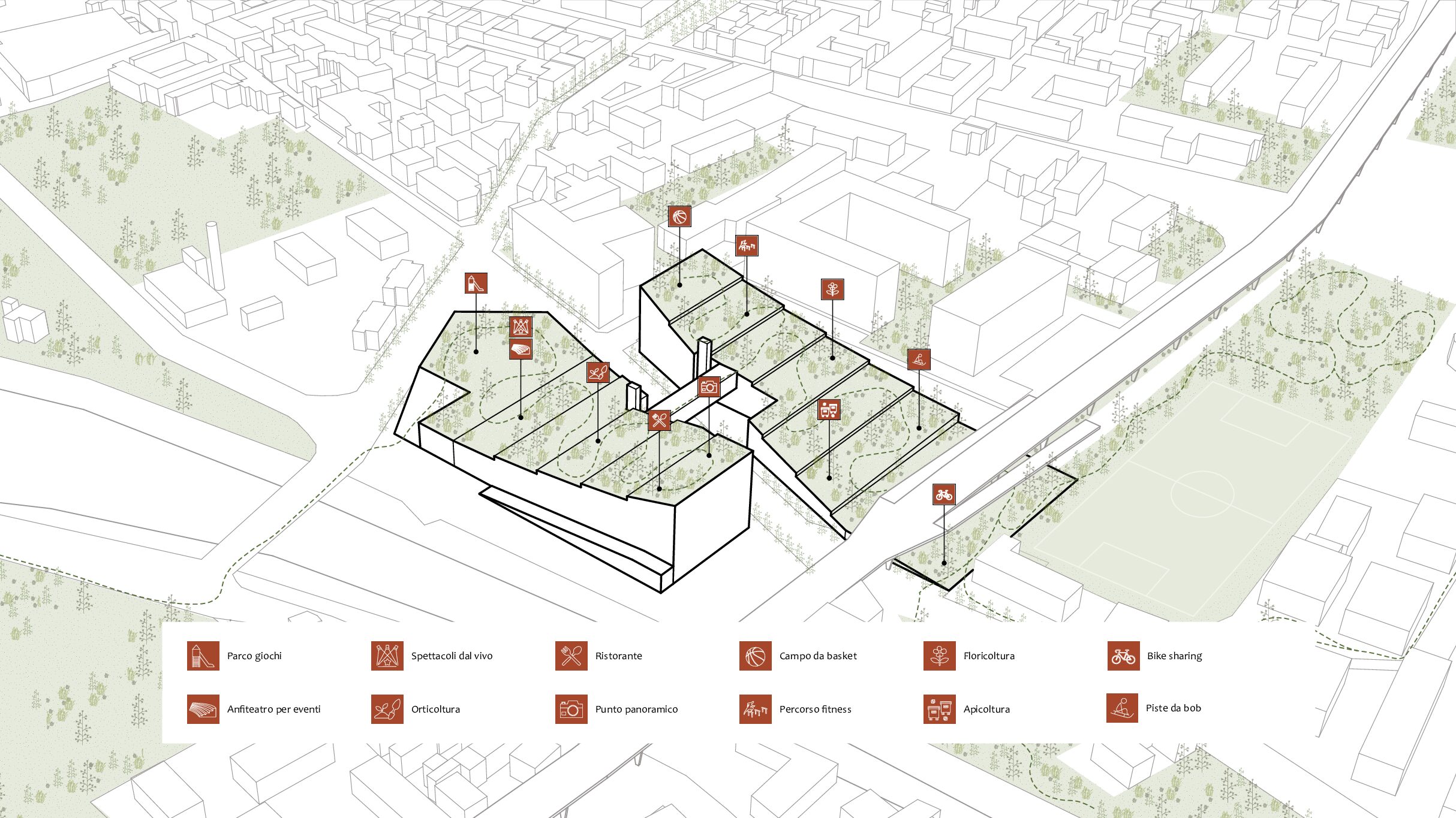 Il concept prevede che il deposito multipiano venga coperto da un parco pubblico a connessione tra quello esistente di Clementina sul lato est e il futuro di porta sud a ovest. Un parco che diventa la connessione tra due aree della città ad oggi degradate con attività che favoriscono l’incontro comunitario, socialità, piste ciclabili, attività di benessere, il tutto godendo di una prospettiva unica su città alta e il resto della città. Un gesto architettonico che regala alla città spazi pubblici di connessione e relazione facendo convivere in maniera rispettosa una funzione invasiva come quella richiesta dal committente, con un edificio a servizio dei quartieri.