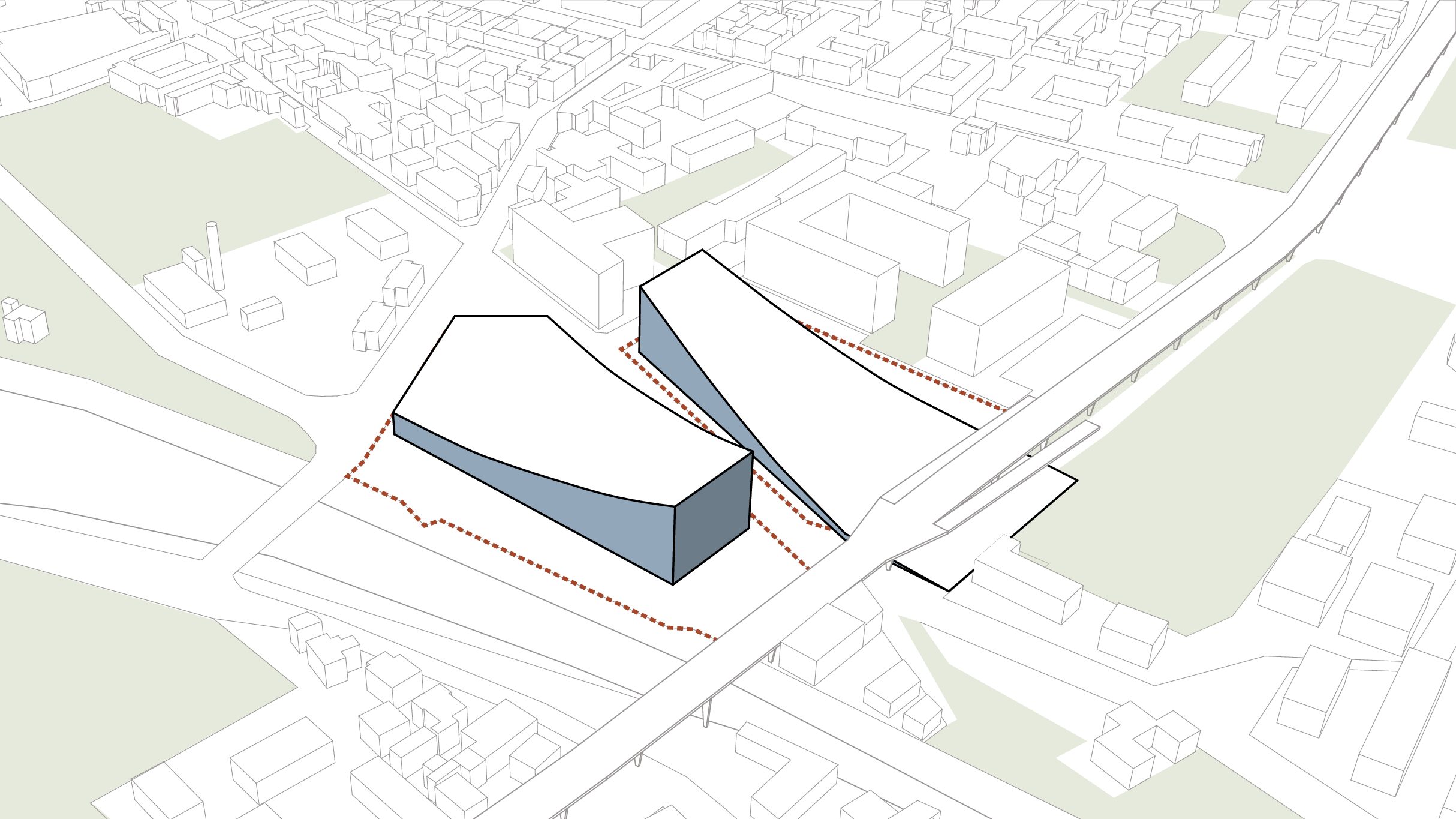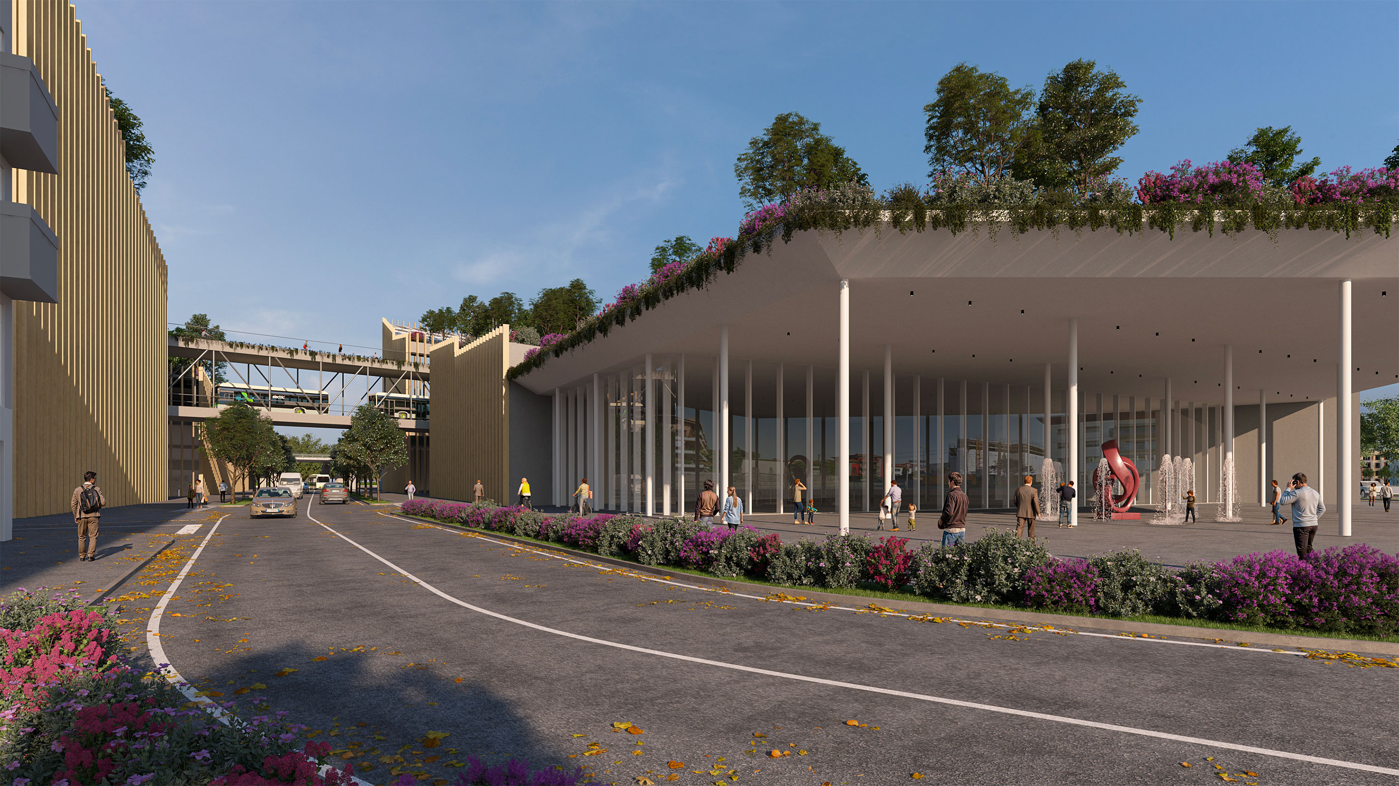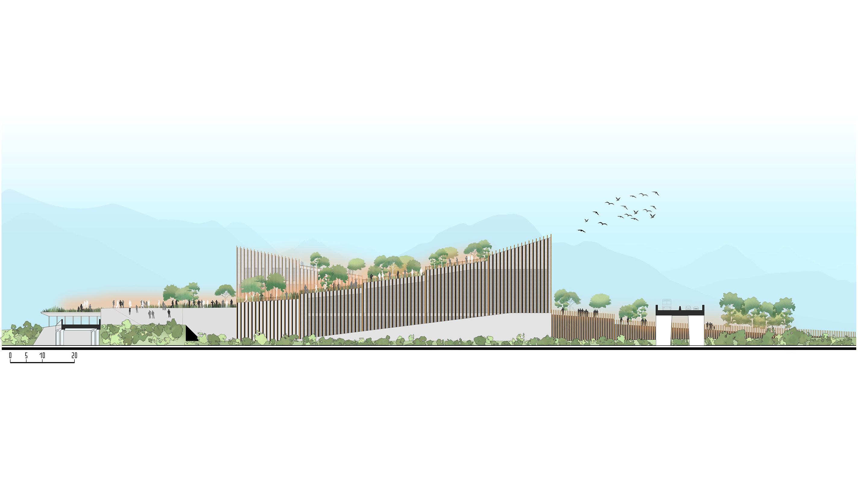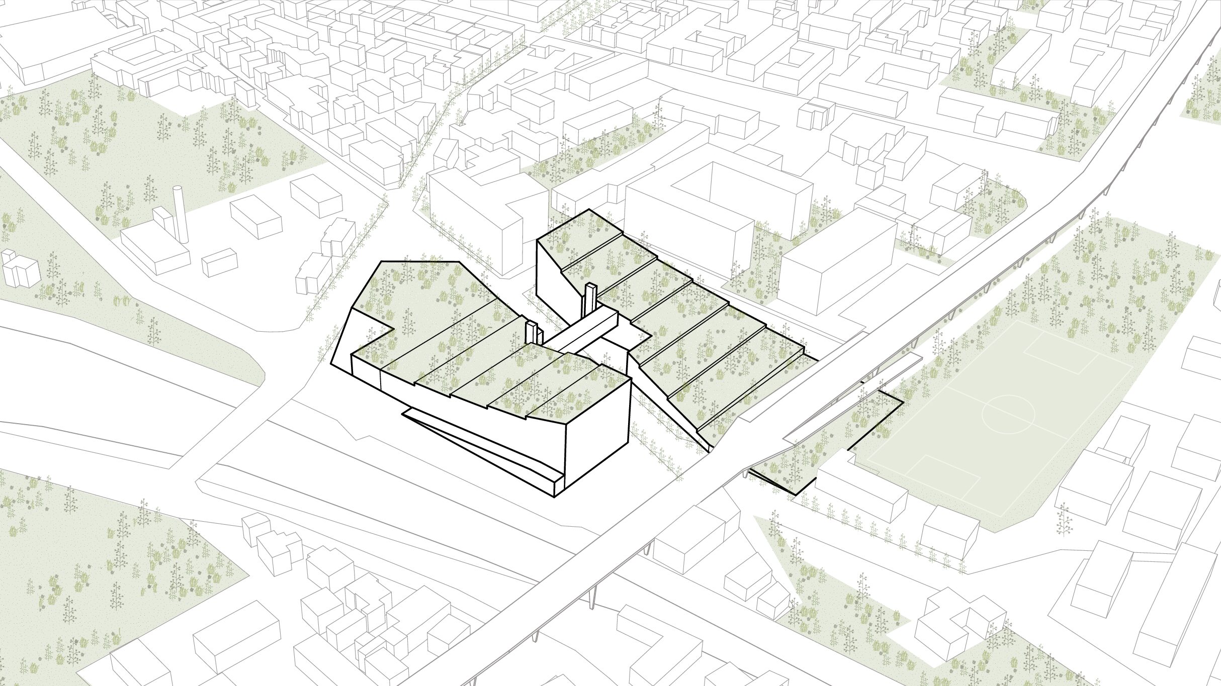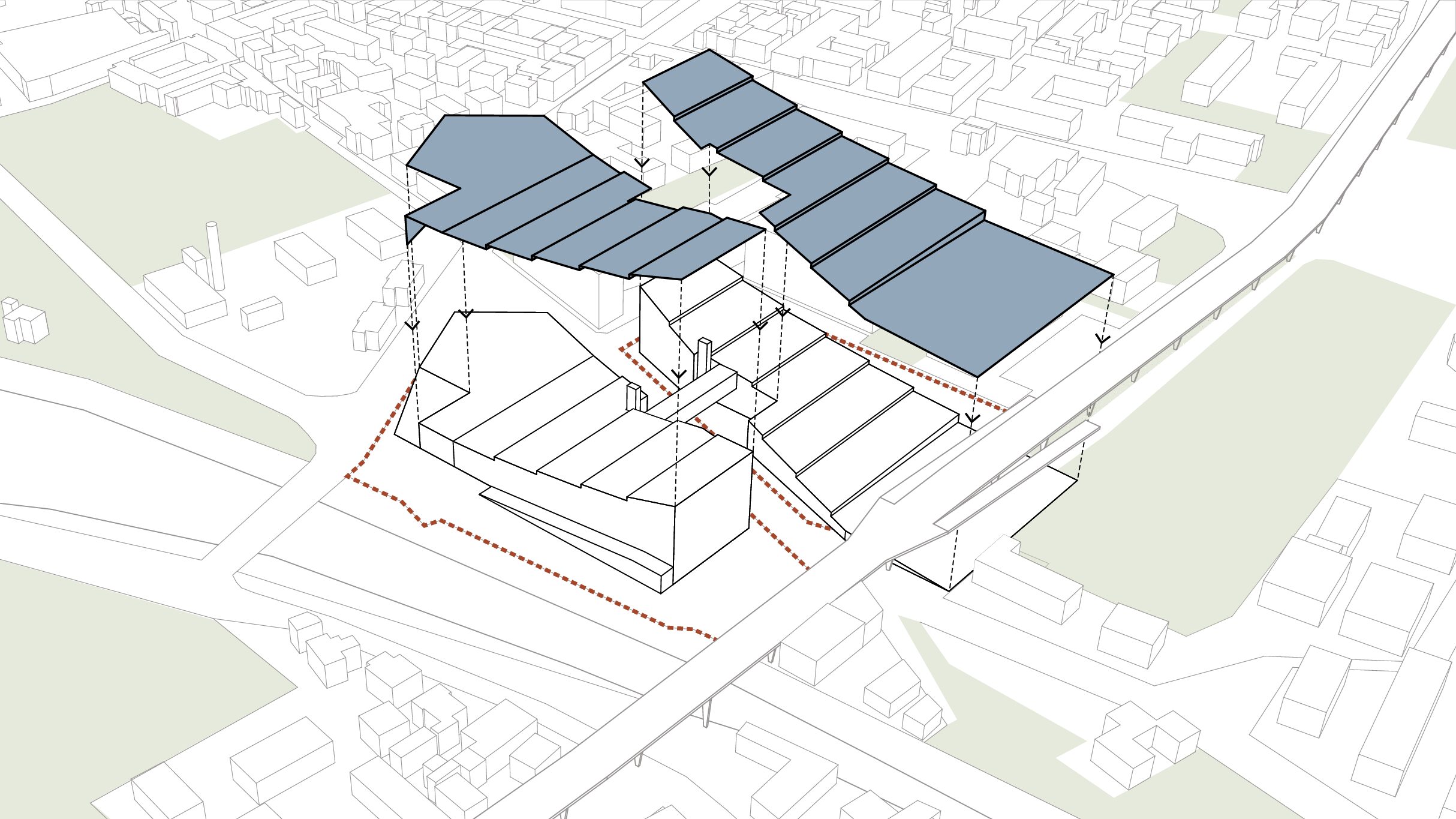 Il concept prevede che il deposito multipiano venga coperto da un parco pubblico a connessione tra quello esistente di Clementina sul lato est e il futuro di porta sud a ovest. Un parco che diventa la connessione tra due aree della città ad oggi degradate con attività che favoriscono l’incontro comunitario, socialità, piste ciclabili, attività di benessere, il tutto godendo di una prospettiva unica su città alta e il resto della città. Un gesto architettonico che regala alla città spazi pubblici di connessione e relazione facendo convivere in maniera rispettosa una funzione invasiva come quella richiesta dal committente, con un edificio a servizio dei quartieri.
